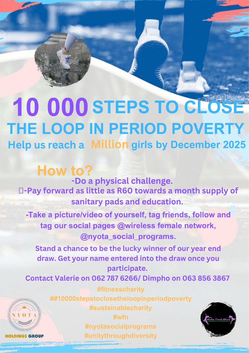 Menstrual health challenge by doing 10 000 steps of any physical activity, pay it forward for a month's supply of Sanitary products for the girl child and homeless woman and education available to all.